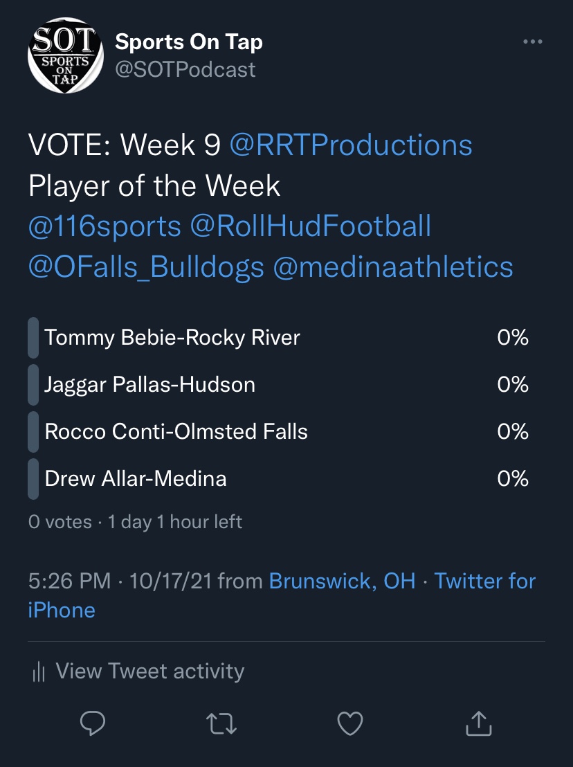 Vote now on our Twitter page, @SOTPodcast, for the Week 9 G and G Fitness Coach of the Week and the RRT Productions Player of the Week. The nominees are listed below.