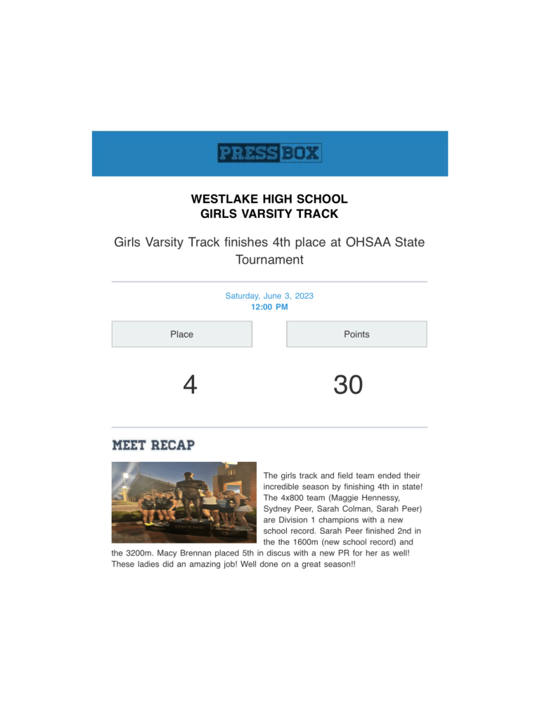 Girls Varsity Track: Westlake finishes 4th Place at OHSAA State Tournament