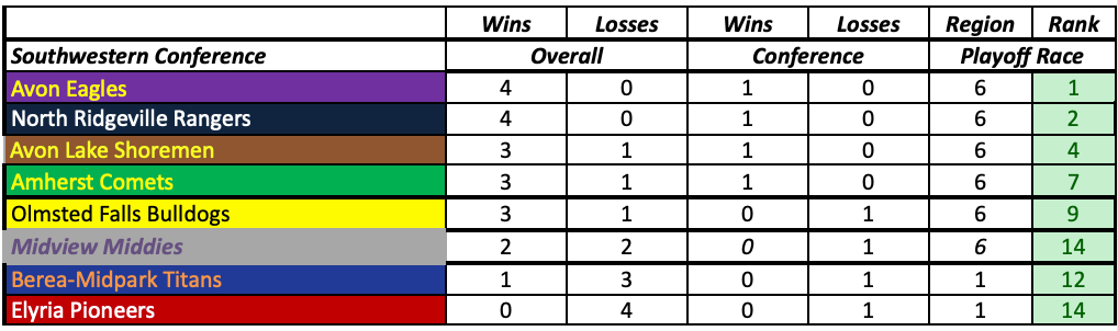 Southwestern Conference: Standings after Week 4 September 13, 2023September 15, 2023 sportsontappodcast G&G Fitness Coach of the Week, Great Lakes Conference, Greater Cleveland Conference, High School Football, Southwestern ConferenceAmherst Comets, Avon Eagles, Avon Lake Shoremen, Benedictine Bengals, Berea-Midpark Titans, Canton Mckinley, Elyria Pioneers, High School Football, Medina Bees, Midview Middies, North Ridgeville Rangers, Ohio High School Football, Olmsted Falls Bulldogs, Southwestern Conference After Week 4 Standings Share this: Click to share on X (Opens in new window) X Click to share on Facebook (Opens in new window) Facebook Like Loading... Related
