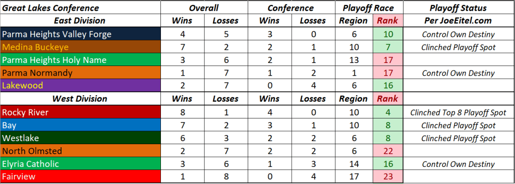 Great Lakes Conference Standings October 18, 2023 sportsontappodcast Uncategorized@SOTPodcast, Great Lakes Conference, High School Football, Sports On Tap Great Lakes Conference Standings for Week 10 Share this: Click to share on X (Opens in new window) X Click to share on Facebook (Opens in new window) Facebook Like Loading... Related