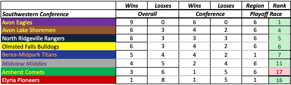 Southwestern Conference: Standings after Week 9 October 18, 2023October 17, 2023 sportsontappodcast G&G Fitness Coach of the Week, Great Lakes Conference, Greater Cleveland Conference, High School Football, Southwestern ConferenceAmherst Comets, Avon Eagles, Avon Lake Shoremen, Benedictine Bengals, Berea-Midpark Titans, Canton Mckinley, Elyria Pioneers, High School Football, Medina Bees, Midview Middies, North Ridgeville Rangers, Ohio High School Football, Olmsted Falls Bulldogs, Southwestern Conference After Week 9 Standings Share this: Click to share on X (Opens in new window) X Click to share on Facebook (Opens in new window) Facebook Like Loading... Related