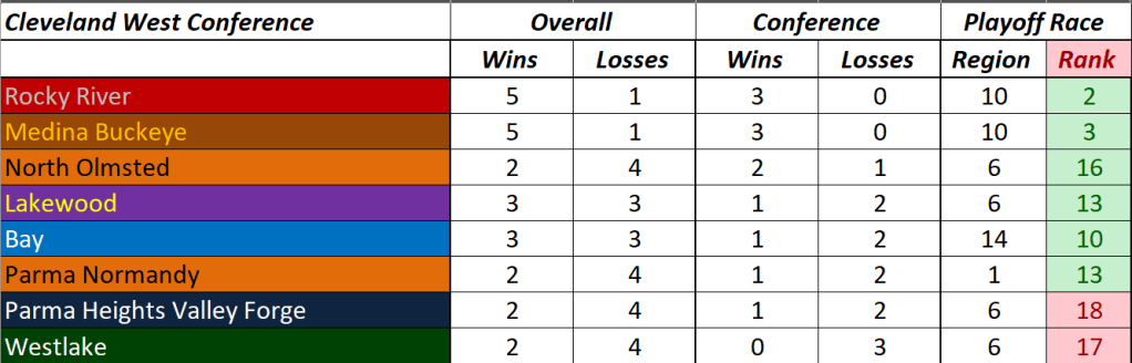 Cleveland West Conference Standings and Computer Rankings October 1, 2024October 1, 2024 sportsontappodcast High School Football, Sports On Tap, YouTube@SOTPodcast, Bay Rockets, Buckeye Bucks Football, Cleveland West Conference, High School Football, Lakewood Rangers, Normandy Invaders, North Olmsted Eagles, Raymond Felton State Farm, Rocky River Pirates, Sports On Tap, Valley Forge Patriots, Westlake Demons Football Playoff Rankings courtesy of http://www.joeeitel.com. Share this: Click to share on X (Opens in new window) X Click to share on Facebook (Opens in new window) Facebook Like Loading... Related