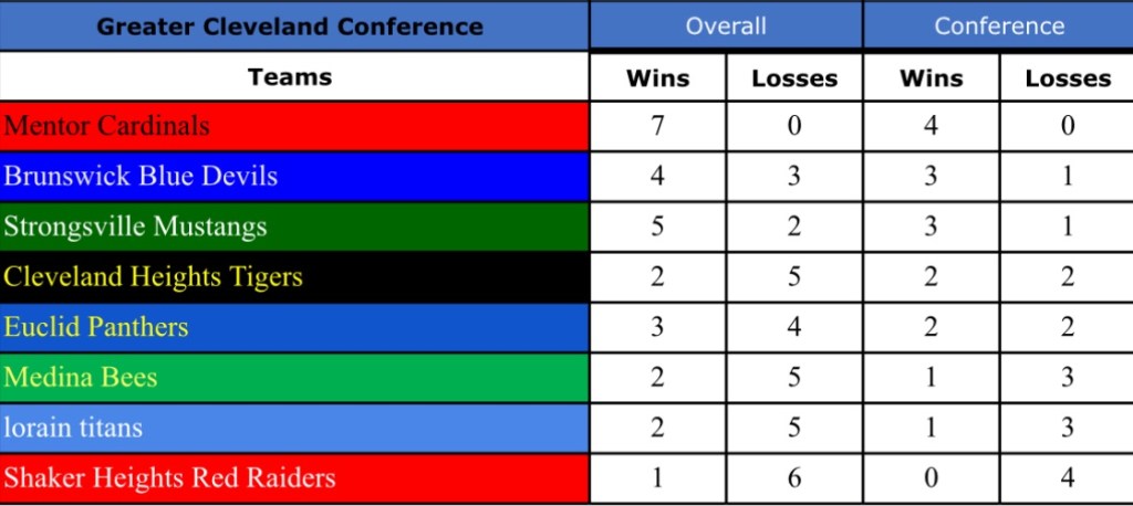 Greater Cleveland Conference Standings Through Week 7 October 4, 2025 sportsontappodcast Uncategorized Share this: Share on X (Opens in new window) X Share on Facebook (Opens in new window) Facebook Like Loading... Related